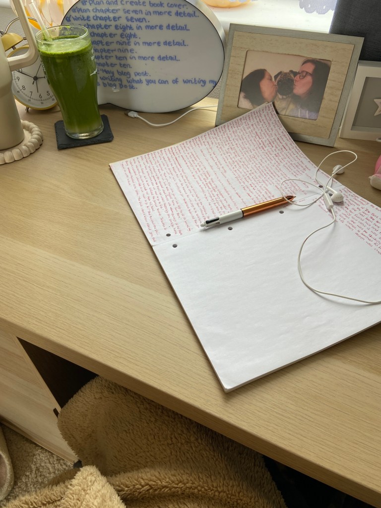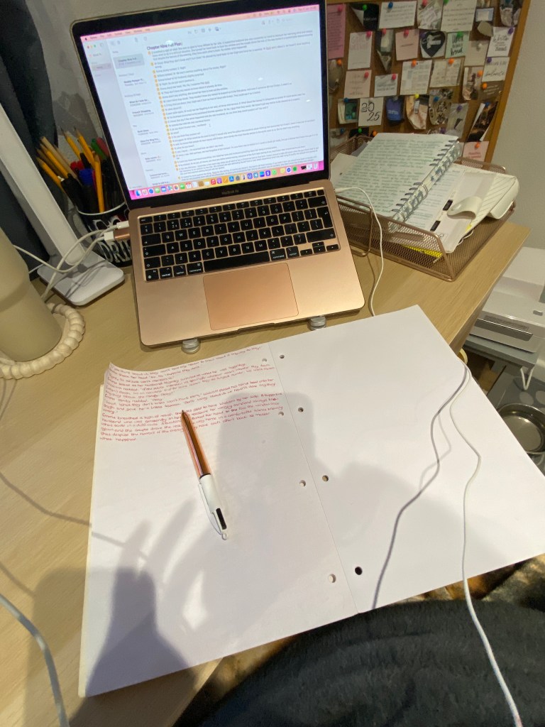 Once the bulk plan has been written, I then turn my focus onto turning this into a handwritten chapter. I preferred this pattern when it came to each chapter as I know if I was handwriting each chapter blind without a detailed plan, I would be spending more time thinking of how it was going to start and constantly crossing out different ideas that it wouldn’t be a coherent chapter by the time I had eventually finished. It may seem a long winded way to some people, but for me, it helps put my mind into some order when I am focusing on each chapter and makes the process less overwhelming.