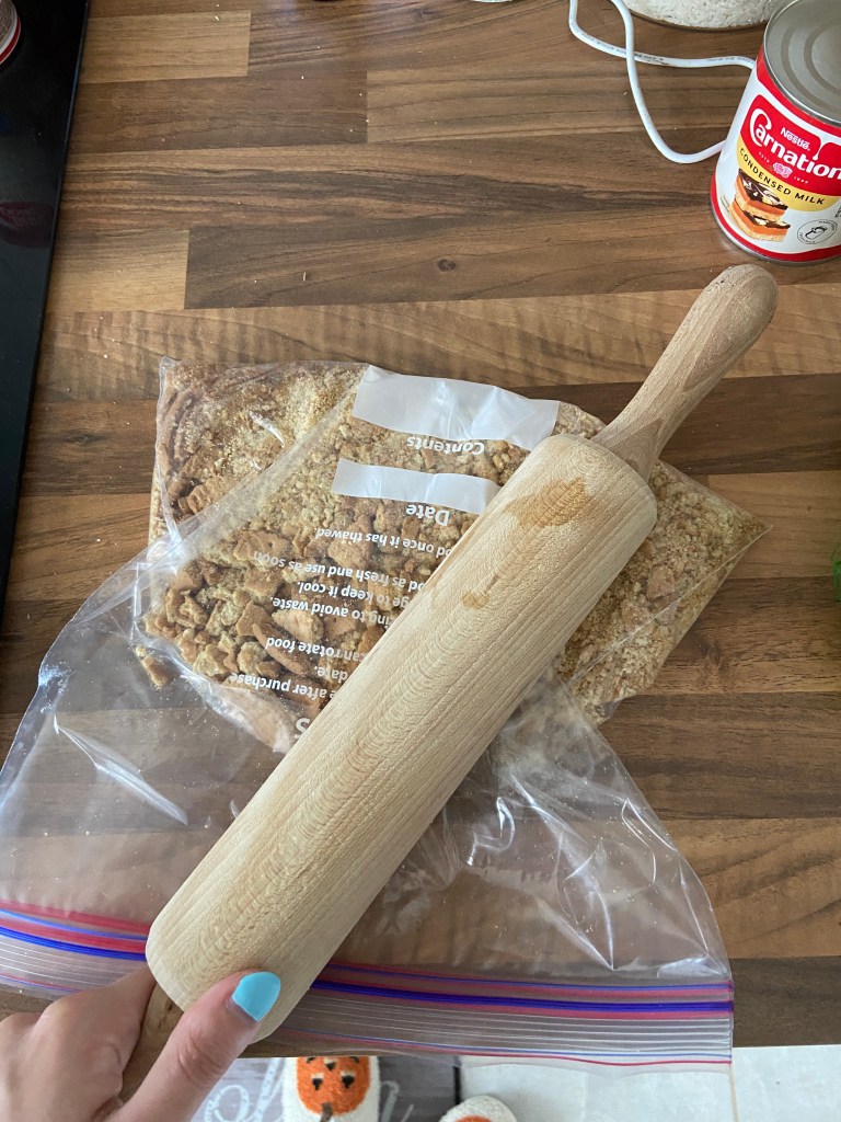 Place the biscuits into a zip lock bag and crush the biscuits into crumbs using a rolling pin.