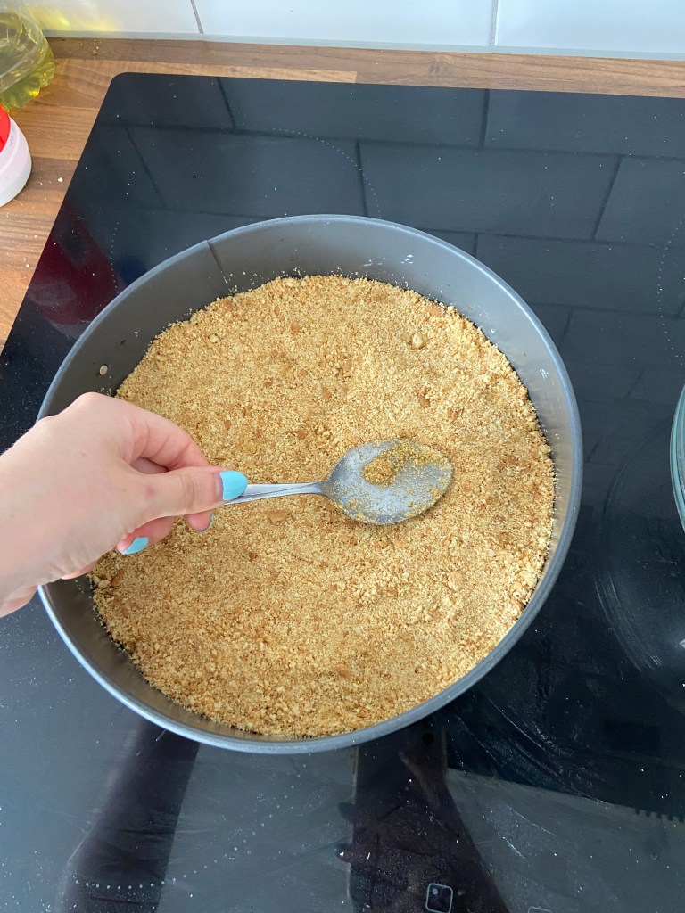 Melt the butter, add this to the biscuit crumbs and mix until combined. Once combined, pour this into the base of the spring-release tin and press the mixture down with the back of a spoon until it’s flat and compact. Place this in the fridge to chill.