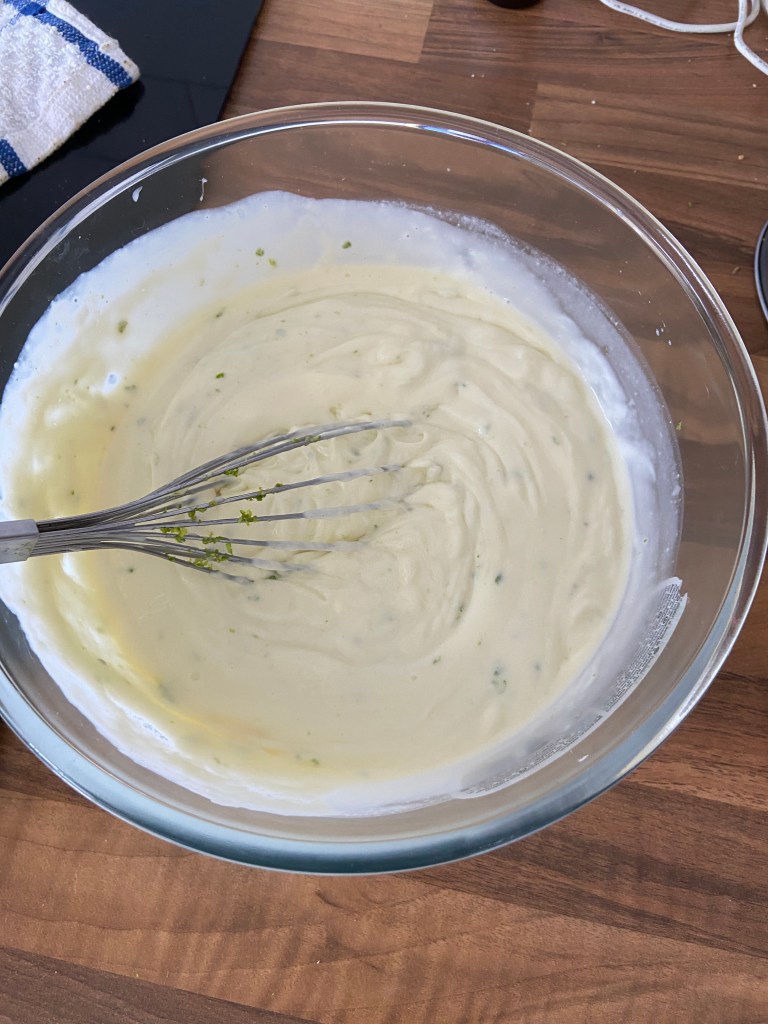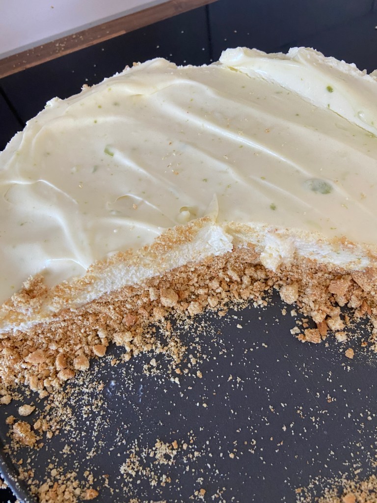 Combine the condensed milk and double cream and whisk until it is thicker in consistency. Once fully combined, add in the lime juice and zest and stir until fully mixed. Pour the cream mixture on top of the biscuit base and flatten it with a spatular, then place this back in the fridge to chill for a few hours.