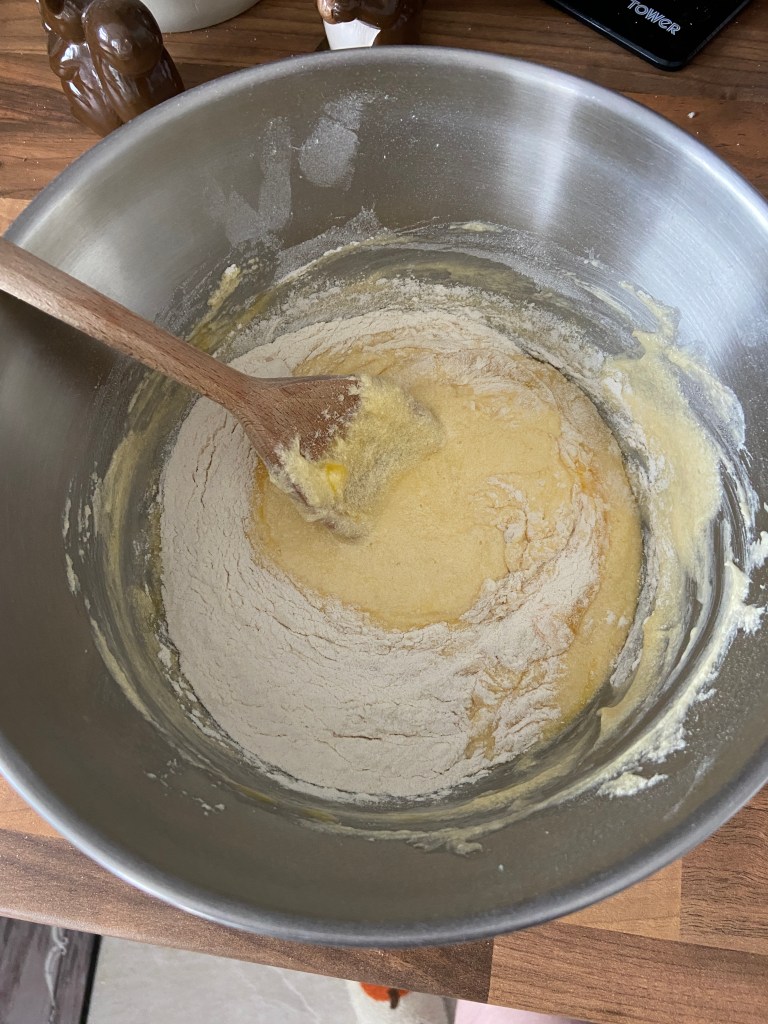 Crack the two eggs into a bowl and beat them until combined, then assemble this into the butter and sugar and mix. Then add the flour.