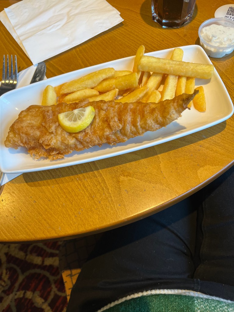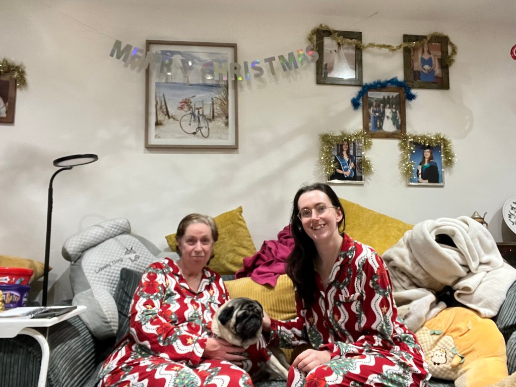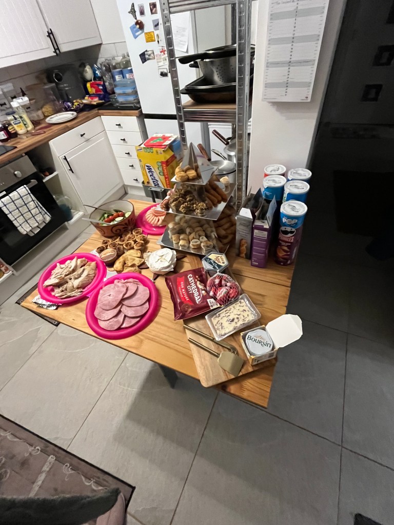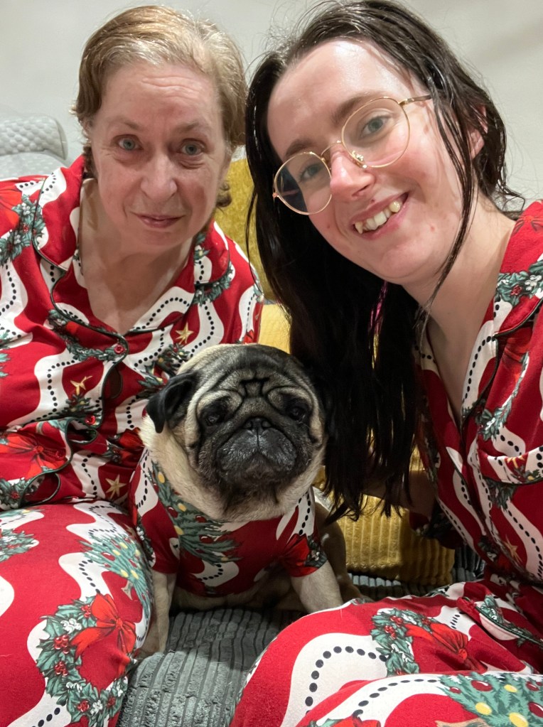 Soon the main events arrived, starting with Christmas Eve! We decided to head out for lunch, which is something we don’t normally do, but it was delicious. We all had tomato soup for starters and I then had a small fish and chips which was sooo good!! It is tradition in our household to have a photo of us in our matching pjs, which are from Chelsea Peers, that we always wear on Christmas Eve (and yes Bertie also has them, not that he is too thrilled about wearing them). You will also notice that on Christmas Day we dressed Bertie up as a Christmas tree. I can confirm that Bertie was very warm and cosy and slept in it for the whole day – typical Bertie. I didn’t get much of our Christmas dinner, but I did manage to snap a picture of our prawn cocktail, which was delicious and I have requested that we make that a tradition whenever we have a roast dinner in 2026. Our Christmas Day was quiet and lovely. Thank you to everyone for my gifts, I am incredibly grateful for them all. Onto Boxing Day, Mum provided us with a lovely buffet to snack on and we spent the day in front of the TV – my perfect day really!
